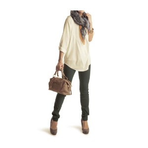 太ももの一番太い部分を隠す丈のチュニックと合わせれば、見た目もぐっとスマートに。パンプスとブーツ、どちらにも似合います。