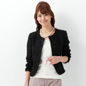 ざっくりとしたツイードの風合いが上品なベーシックなノーカラージャケット。ウエストを軽く絞った、すっきりとしたシルエットです。