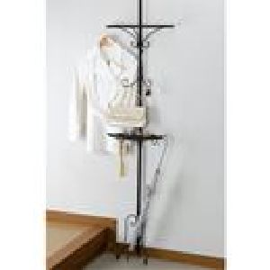 天井つっぱりと、3点式の脚で耐荷重も十分。上段の半円リング、その下のフック、下段の収納棚兼ハンガーの全てが高さ可変式。