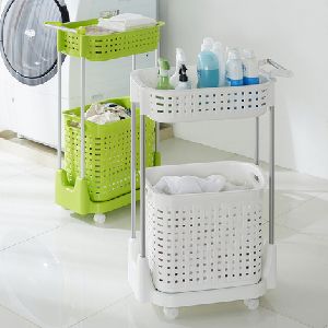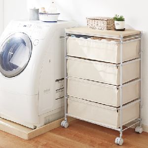 タオルやパジャマ、洗剤を置くなどに便利な棚と、脱いだ服や洗濯物を入れるのに便利な、取り外せるバスケットが付いたランドリーワゴン。