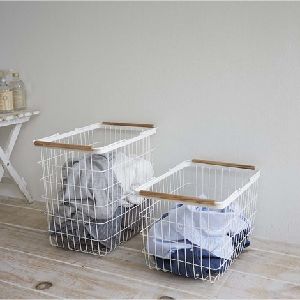 スチールと木製のバーの組み合わせが、おしゃれなワイヤーバスケット。清潔感のあるやさしい木製の持ち手は、にぎりやすく、ランドリーシーンも華やかにまとめてくれます。