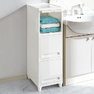 水に強く、お手入れしやすい樹脂製で、ランドリーからリビングまで置けるシンプルな収納ラック。前扉は上に収まるフラップ式で、出し入れがラクです。