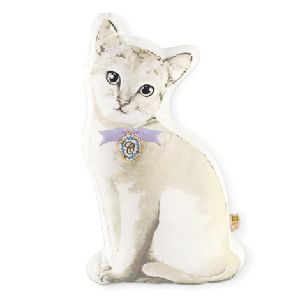 ネコのフォルムに繊細なタッチでプリントを施したネコ型クッション。裏面にも後ろ姿を描き、リアルなリボンチャームがこだわりです。