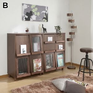 フラップ扉や引出しの前面に、雑誌やCDジャケットを飾ることができるディスプレイラック。木目調のカラーリングとクロスガラスの組合せがレトロなイメージを演出します。