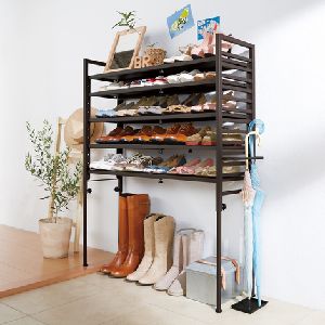 玄関の段差をまたいで設置できる伸縮シューズラック。幅も高さも変えられ、スペースや用途に合わせてぴったりの収納が可能です。