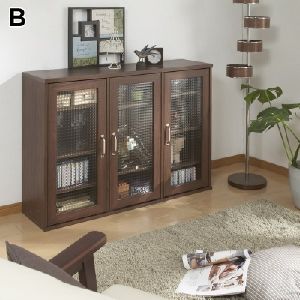 フラップ扉や引出しの前面に、雑誌やCDジャケットを飾ることができるディスプレイラック。木目調のカラーリングとクロスガラスの組合せがレトロなイメージを演出します。