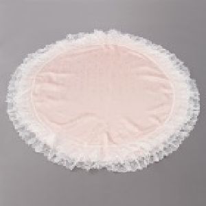 欧州貴族の女性が好んだといわれるモアレジャガード生地に、柔らかな表情のレースをフリルでたっぷりとあしらったプリンセスなイメージの円形クロス。