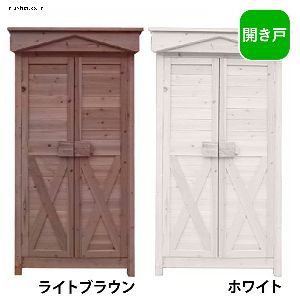 木製収納庫ハイタイプです。ホワイトとライトブラウンの二色展開です。。お庭の雰囲気を壊すことなく、ガーデンアイテムを収納できます。
