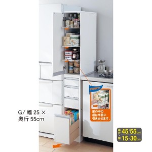 冷蔵庫の横などキッチンのすき間を使って、収納スペースに有効活用。幅13cmのスリムタイプで、こまごまとしたスパイスやビン類などをたっぷり収納できます。