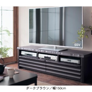 前面の引き戸の横桟ラインが視覚的な広がりを生むテレビ台。やや張り出した天板と底部分にある幕板が醸しだす重厚感に、先細りの脚が軽快感をプラス。