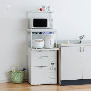 背面オープンだからキッチン側とダイニング側、両面使いができてカウンター上で大活躍。Aタイプは中を隠せるフラップ扉、Bタイプはフラップ扉に、取り出して食卓などに持ち運べるトレイ付き。