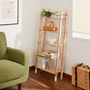 シンプルなデザインにスタイリッシュな工夫をさりげなく凝らした、立て掛け式のラダーラック。サイドのフックにひもを引っ掛けながら組み立てると、赤いひもがおしゃれなアクセントに。