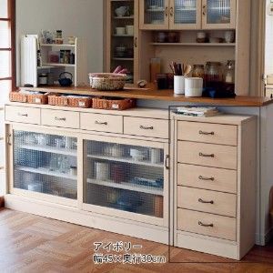 上段の引出しはキッチンクロスやカトラリー類を、扉内には普段使いの食器などを収納。テーブル上にササッと食事の準備できて便利です。引戸タイプだから開閉の場所もとりません。前板や扉枠には天然木のパイン材を使用。クロスガラスがほどよく中を隠すので食器も小物も見栄え良く整理でき、ダイニングに品よくマッチします。奥行30cmの薄型タイプは、対面キッチンなどのカウンター下にすっきり置けてスペースを有効活用できます。奥行40cmタイプは収納力たっぷりでリビングキャビネットにもおすすめ。アイボリーとナチュラルの2…