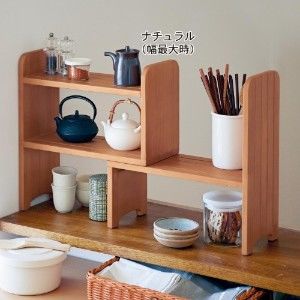 天然木の2つのパーツを組み合わせて、カウンター上に好みの収納スタイルがつくれるシェルフ。スライドさせることで好きなサイズに幅を調節できます。