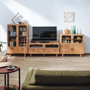 天板と前板に使用した天然木アルダー材の手触りが醸し出すナチュラルな風合いと、フラップ扉のクロスガラスがかわいいシンプルナチュラルテイストなテレビ台。