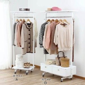 欲しいサイズで使える伸縮式で大量収納OK。キャスター付きで位置替えもスムーズです。上下2段式のハンガーバーの奥に、シーズンオフのブーツやバッグ類がたっぷりしまえる可動棚3段を設置。