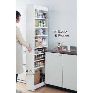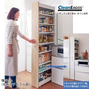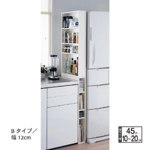 幅10cm〜20cmまでの2cmピッチで6サイズ揃った隙間収納。前オープンのAタイプと横オープンのBタイプがあり、Bタイプはこぼれ止め付きでスパイスなどの収納に重宝。