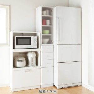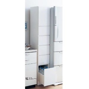 キッチンのすき間を有効活用できるスリムなチェスト。上部はプッシュ扉で中は可動棚が1枚。引出しにはレトルト食品や乾物などを収納できます。