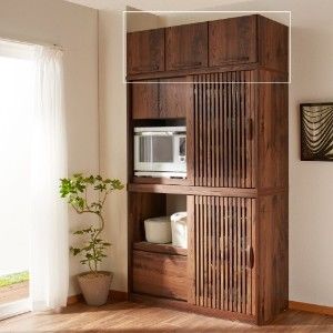 上部扉のアルミフレームがシャープな印象のキッチンラック。フロスト調のアクリル板を使用しているので、中が見えにくく見た目すっきり。