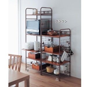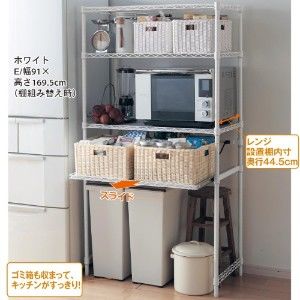 耐荷重25kgの可動棚を備えた大型レンジ対応ラック。大型レンジ、炊飯器、電気ポットなど、家電一式が収まって、キッチンがすっきり片付きます。