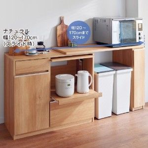 炊飯器や湯沸かしポットなどを置くのに便利なスライド棚付き。天板上には電子レンジやトースターなどを置いて、キッチン家電をひとまとめに。
