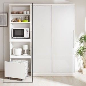 ダストボックスの上を有効活用。スライド棚付きなのでレンジ台としても。隙間使いの幅30cmと、オーブンレンジも置ける幅60cmと隙間や用途に合わせて選べる。