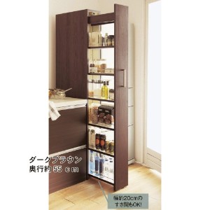 シンク脇などのすきまを有効活用できる、幅20cmのストッカー。ペットボトルやレトルト食品の収納に便利です。