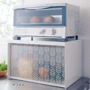 オーブントースター下を活用できる収納ボックス。シルバーは錆びにくいステンレス製。葉っぱ柄のフラップ扉で取り出しやすく、さりげなく中身を隠します。