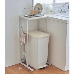 ダストペール上に収納が作れるラック。スペースに合わせて幅伸縮するので、シンク横のスペースもムダになりません。