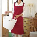 頭からスポッとかぶるだけで着用できる背中クロス仕様のエプロン。ボタンやウエストヒモがないので着脱がらくちんです。