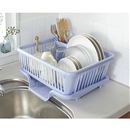 扱いやすいプラスチック製の水切りかごで清潔に。食器類から落ちる水をシンクに直接流せる排水口のトレーがポイント。
