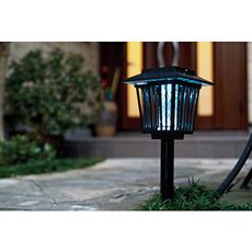 明るく照らす照明モードと、青光で虫を誘導し撃退する殺虫モードの切り替え式。光センサー内蔵で暗くなると自動点灯、明るくなると消灯します。