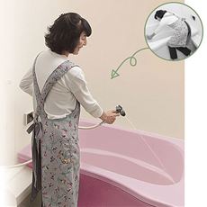 ジェット水流でお風呂汚れを狙い撃ち!立ったままでラクラクおそうじ。触りたくない排水口も!お風呂のフタのヌメリも!洗いにくいエプロン裏も!手の届かない天井汚れも!