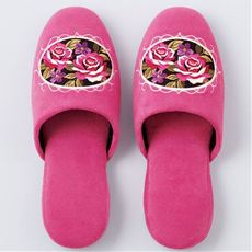繊細なローズ柄のトイレカバー、トイレマット、スリッパをまとめて買えば、上品なトイレ空間を演出する。