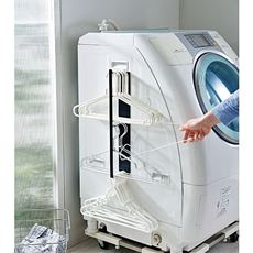 洗濯機の横にしっかりくっつくマグネット式のフック。かさばる洗濯ハンガーをスリムに収納でき、物干しがスムーズ!