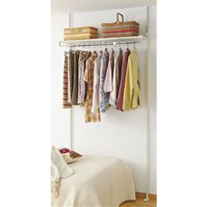 サッシ前で部屋干し&小物収納に便利な棚付き!窓際や狭い部屋にも簡単に設置でき、欲しかったハンガーや上棚が出来て重宝します。