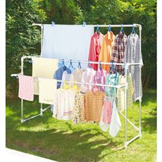丈夫で軽いアルミ製。アコーディオンのように幅が伸縮し、干す量に応じて自在に調節できます。洗濯物をかけたままでも縮めて移動できるから、急な雨でも安心!