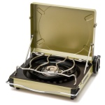 室内に限らず外にも持ち運びやすい、取っ手付きのカセットコンロ。トップカバーと風防リングのW風防で風に強く、アウトドアでもオススメです(*)。