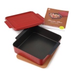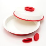 ご家庭の電子レンジをつかって料理を早く美味しく。<レンジで簡単調理プレート>のご紹介です。底面に施された電磁波に反応する特殊な発熱体がポイント。