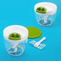 電源不要、食材をセットしたらハンドルをひっぱるだけでみじん切りができる、ぶんぶんチョッパー・デラックスとスーパーデラックスのセットです。