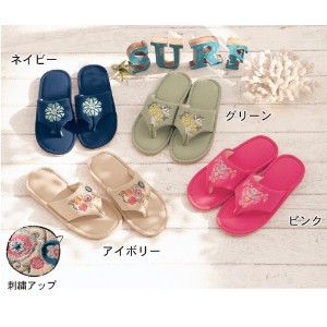 アフリカンなビーズ刺繍をあしらったデザイン。中敷きは爽やかな夏素材。トングと甲の裏側はパイルで足あたりやわらか。