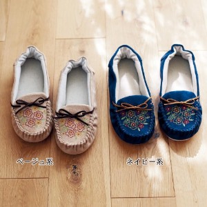 クロスステッチ風刺繍が可愛い。かかとはゴム入りで脱げにくく、裏面はパタパタ音がしにくいスエード調素材。