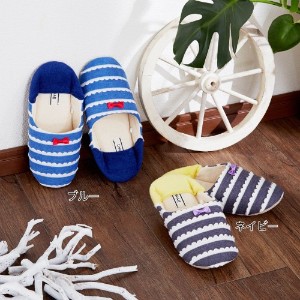 なみなみレースで描いたボーダー柄とリボンがかわいい、マリンテイストのバブーシュ。かかと部分はパイル地になっているので、汗をかきやすい夏場も爽やかな履き心地です。