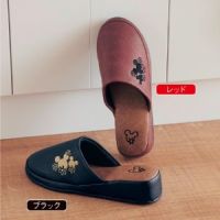 ほどよいヒールで立ち仕事がラク サイドのミッキーモチーフの刺繍がアクセントになったスリッパ。疲れにくいヒール付きで、つま先の内側にふくらみがあって前すべりを防止。