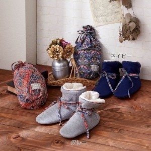 柔らかで歩きやすいニットの室内履き。中はボアで、つま先から足首まであったかです。かかと部分に別布を施したデザインもかわいらしい。