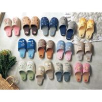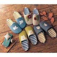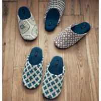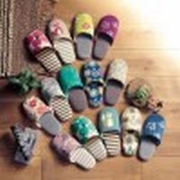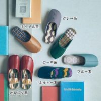 ざっくりとしたニュアンスのある生地にシックなトーンで北欧調のプリント柄を描きました。やわらかな履き心地で足入れがよく、裏面はパタパタ音がしにくい仕様。