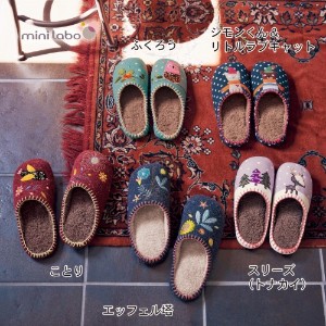ミニラボの人気キャラクターをアップリケ刺繍したルームシューズ。中敷きはパイル素材、低反発ウレタン入りで履き心地快適です。