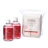 コットンに含ませて拭き取るだけ、洗い流し不要の「クレンジングウォーター(拭き取り用クレンジング水)」×2本、ふんわりとやさしいソフトな肌当たりの「オーガニックコットン」80枚のセットです。