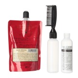 髪にツヤを与えながら、気になる白髪を染めていく洗い流しタイプの全体染め用「ボタニカルカラートリートメント(トリートメント染毛料)」と、「クシ付詰替え容器」、「クシ部洗浄用ボトル」のセットです。