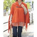 軽くて柔らかな毛布生地のポンチョ。シール織りに毛の混紡糸を入れ込むんでより暖かく、ボリューム感と弾力性に富んだ織物になりました。